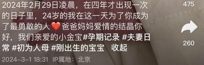 王逸宸发文透露,自己是在 2 月 29 日凌晨生产," 在四年才出现的日子里,24 岁的我在这一天,为了你成为了最勇敢的人 "。
