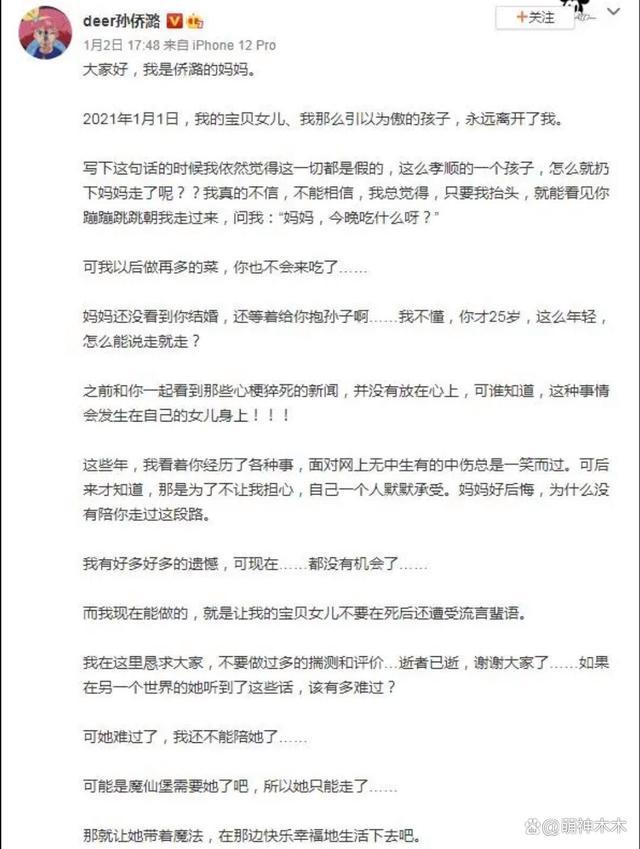 据孙侨潞妈妈所言,孙侨潞在 2021 年的第一天因为心肌梗塞而猝死。那个年仅 25 岁的女孩没来得及留下只言片语,就已经香消玉殒,实在令人唏嘘。用孙侨潞妈妈的话来讲,就是 " 可能是魔仙堡需要她了吧,所以她只能走了 "。