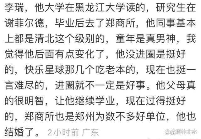 如今的他可以说是事业有成,家庭美满。他在研究生毕业之后就去了郑商所,成为了一名 " 打工人 "。此前,曾有网友偶遇在郑州某论坛上上台发言的李瑞,他身穿黑西裤白衬衫,戴着眼镜,沉稳内敛。