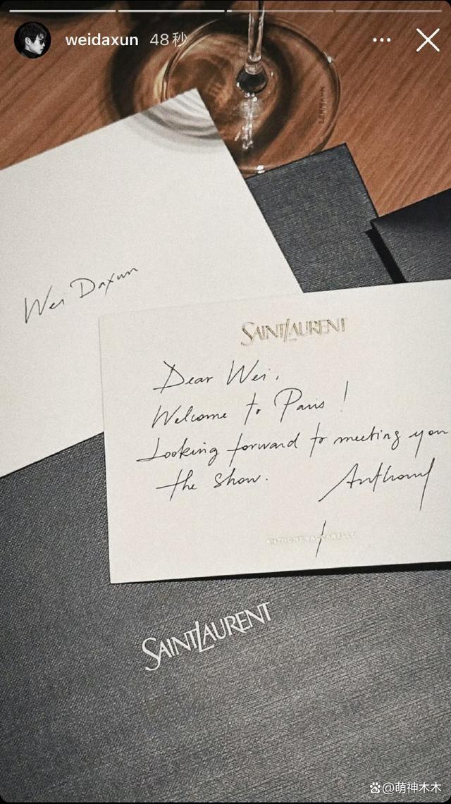 穿上西装之后,身高优势也显现出来了,肩宽腿长,身材比例十分优越。看秀待遇也很不错,品牌创意总监手写邀请函,赚足牌面。