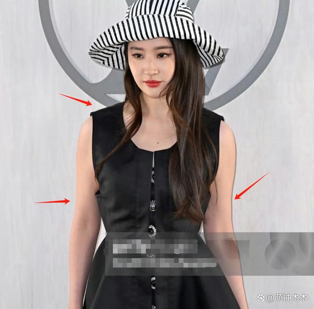 不过无袖的连衣裙还是暴露了刘亦菲的粗胳膊和驼背的问题,显得人很臃肿,发型也成为了败笔,偏分之后让刘亦菲的发量显得不是很健康,侧边刘海还有些油,已经可以想象帽子下面贴头皮的尴尬了。