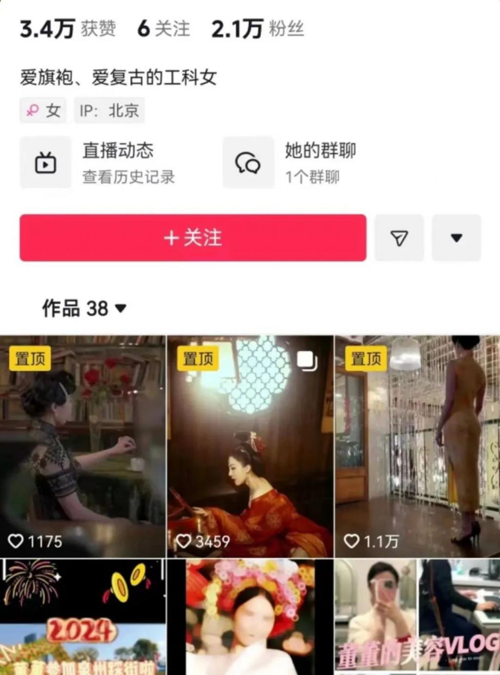 2023 年 12 月 31 日,某平台里有个酷似董小姐的博主在这天发布了第一条视频,她随后的视频里展示的内容多为旗袍。