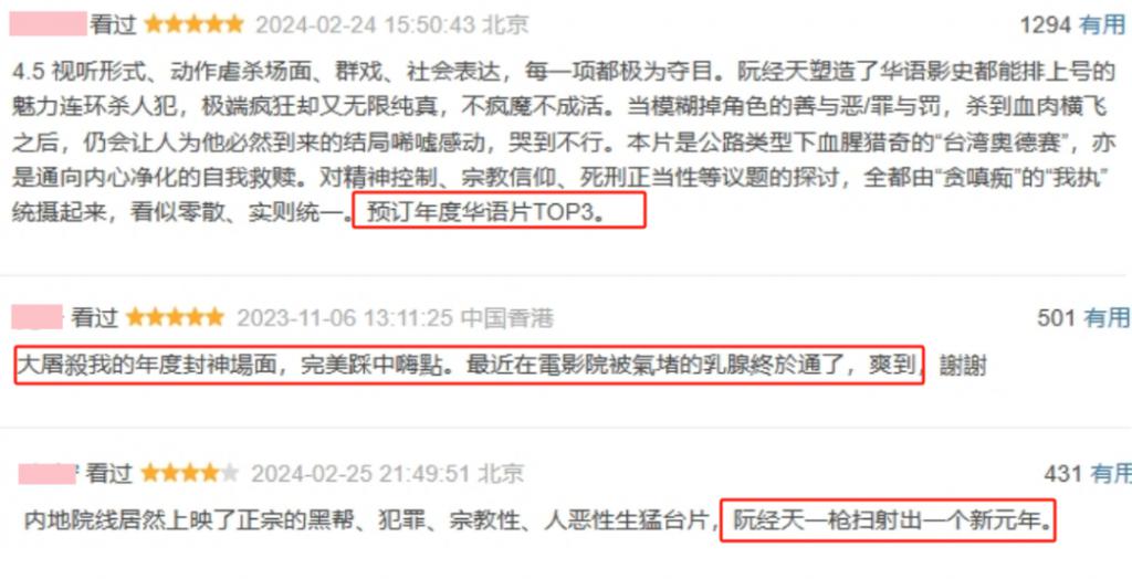 " 跟这比起来,春节档像小学生作业 "、" 屠杀场面真的封神 "、" 这种尺度居然能上院线太牛掰了 "。