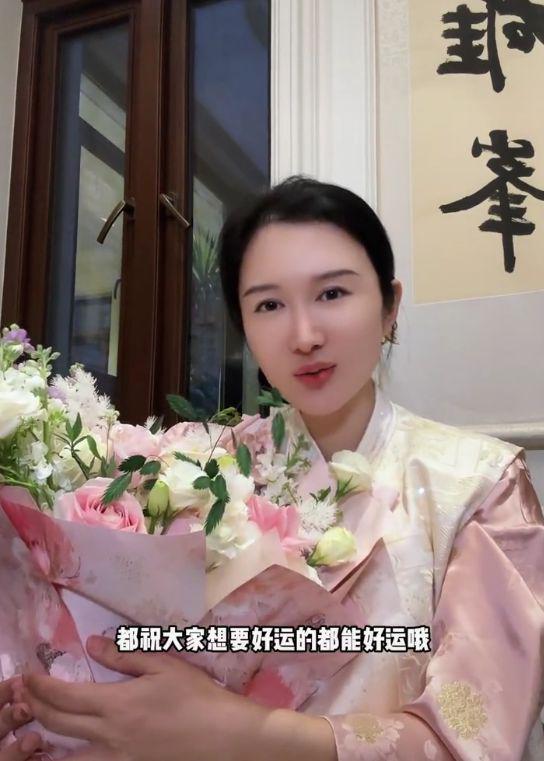 杜星霖穿着粉嫩的中式服装,手捧着粉色的鲜花,对着镜头祝福大家 " 要好孕的都能好孕 ",满脸的幸福与甜蜜。