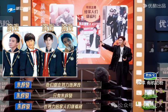 朱梓骁曾表示,演员不是一个主动的行业,永远是被选择的状态。而直播带货这件事," 几乎是把我前 30 年被压抑那些情绪发挥到了极致。" 最近在参加《无限超越班》时,他又表示,曾认为自己会在带货舒适圈做一辈子,来了节目后,他明白演戏才是他想坚持的事,带货直播只是他的后路。