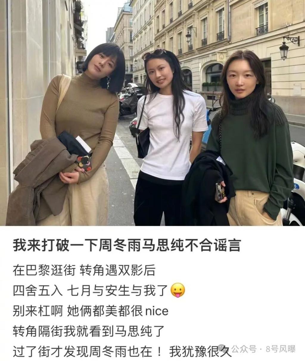 去年十月份,有网友在巴黎逛街时偶遇周冬雨和马思纯,二人的关系看起来很好。