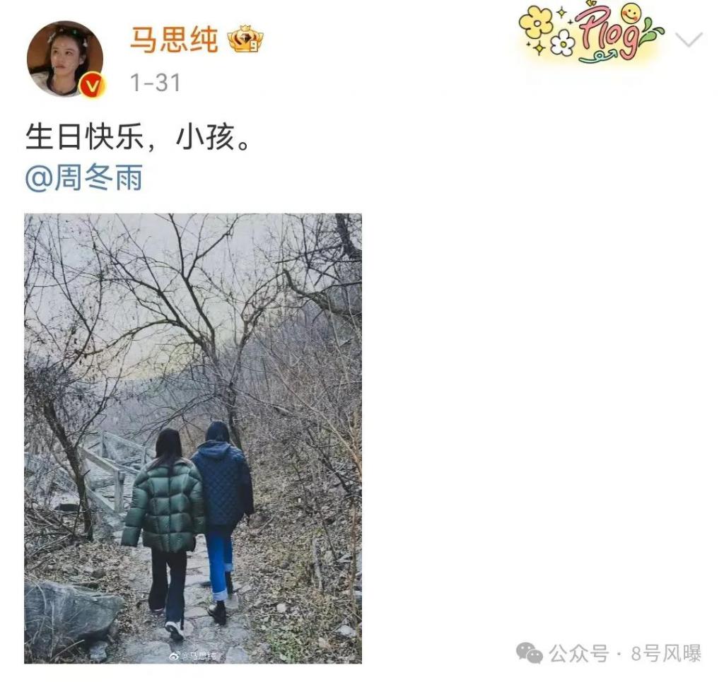1 月 31 日是周冬雨的生日,马思纯发博为周冬雨庆生,并配文称:生日快乐,小孩。