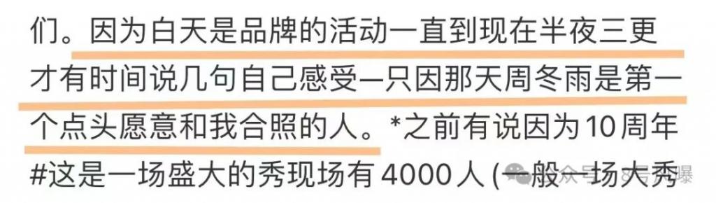 紧接着,也有见过周冬雨本人的网友发博想为周冬雨发声,博主称以前在一次活动中遇到了周冬雨,当时已经是半夜三更,周冬雨是第一个点头愿意和她合照的人,还配上了二人的合照。