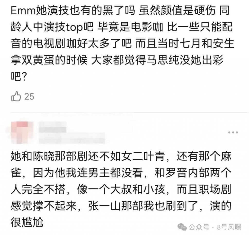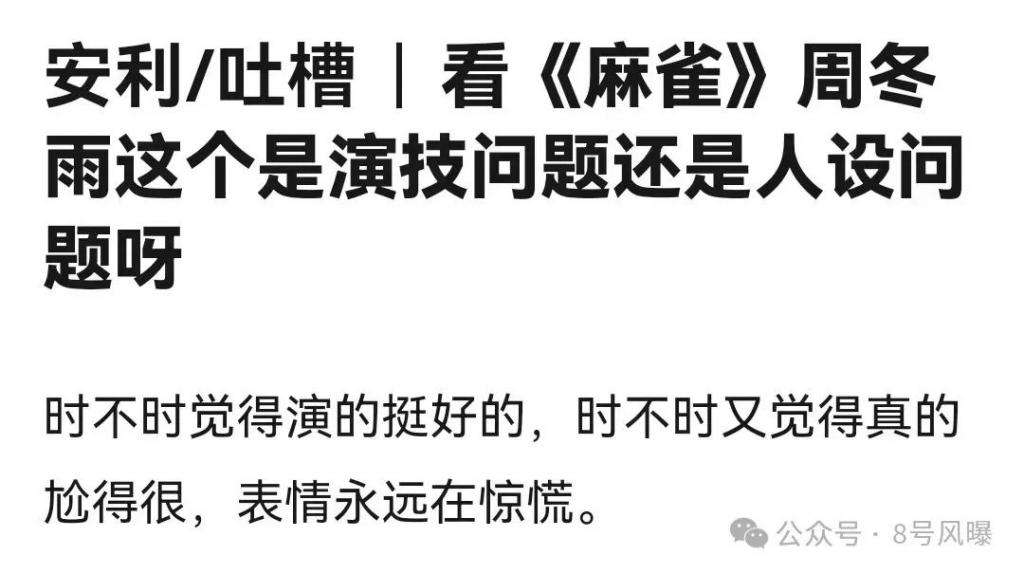 此前在谍战剧《麻雀》中,周冬雨的演技就被网友吐槽过,观众觉得她的表情永远在惊恐,演技不自然。