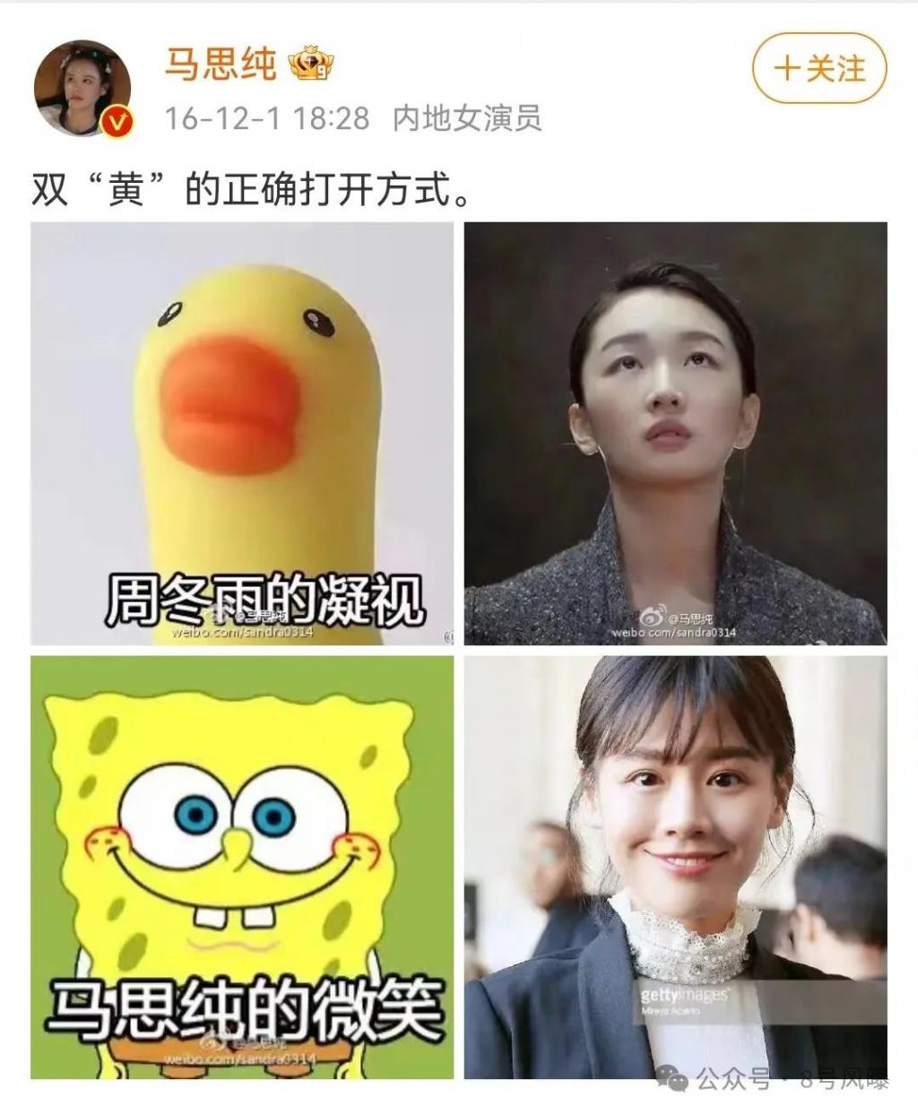 因为马思纯笑起来像海绵宝宝,周冬雨像小黄鸭,于是粉丝给她俩取了个 CP 名叫 " 绵鸭 "。