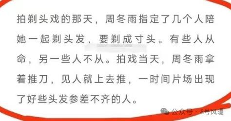 爆料称,因为角色需要,周冬雨要剃寸头,而她蛮不讲理地要求工作人员陪她剃寸头,工作人员不情愿,她就在现场拿着推刀想推谁就推谁,一时间片场出现了好些头发参差不齐的人。