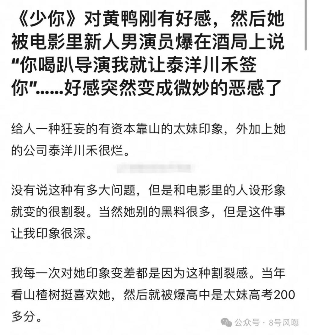 还有网友爆料周冬雨在饭局上很狂妄,仗着背后有资本为难新人,说话很难听,给人一种小太妹的感觉。