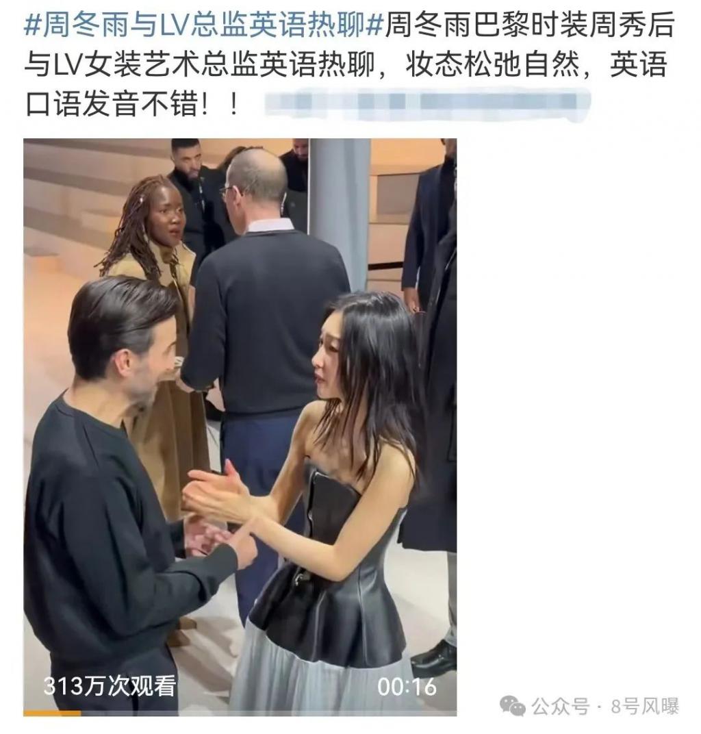 一同登上热搜的词条还有周冬雨在秀场与 LV 总监英语热聊,能与 LV 总监正面交流且优雅从容,可见品牌方对周冬雨的重视,也证实了周冬雨在娱乐圈的 " 咖位 "。