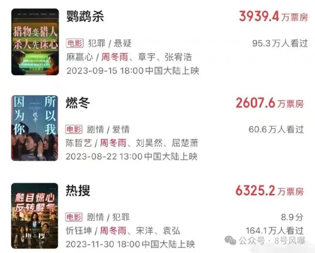 去年,周冬雨连续三部电影上映,分别是《燃冬》《鹦鹉杀》《热搜》,三部电影的票房都很一般,加起来才 1.3 亿左右。