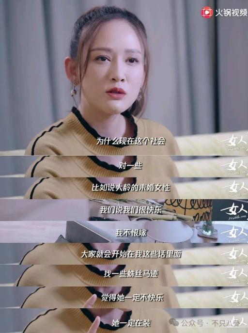 她不理解为什么这个社会对 " 大龄未婚女性 " 很不友好,一定要在她的话里找到一些蛛丝马迹,来确定她过得不快乐。