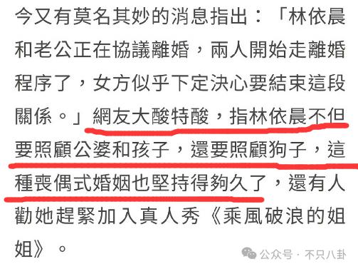 林依晨曾被曝 " 偏门求子无果遭夫家嫌弃 ",生下女儿后又被吐槽是 " 卑躬屈膝的豪门媳妇 ",去年还频繁传出婚变。