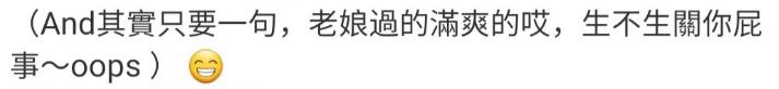 最后,陈乔恩总结了一句爽文式话术回击:" 老娘过得蛮爽的哎,生不生关你屁事!"