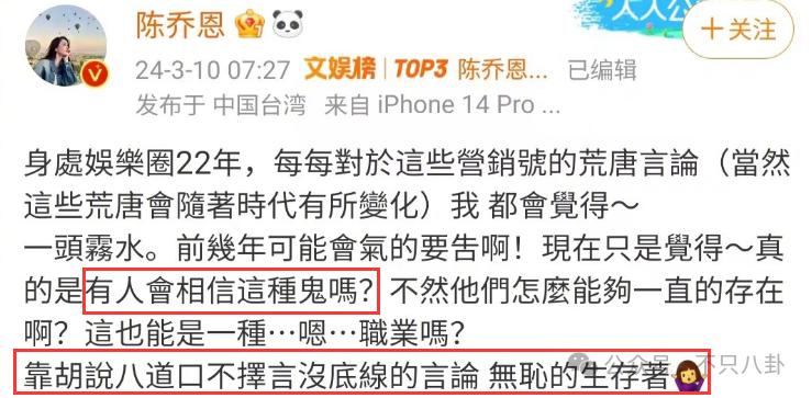 针对各种诸如此类的猜测,陈乔恩再次发文怒怼。