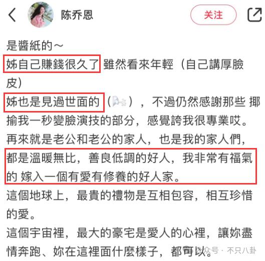 陈乔恩写得很直接:" 姐自己赚钱很久了,姐也是见过世面的,老公的家庭是有爱有修养的好人家。"