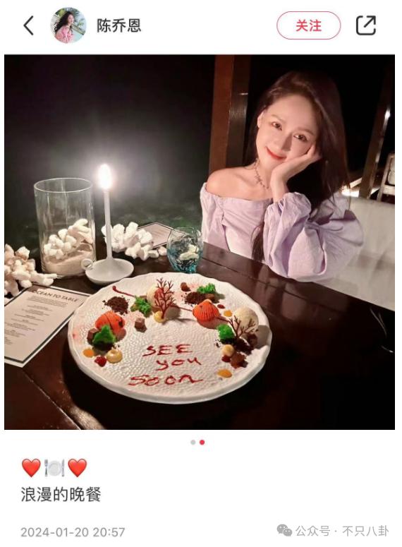 就拿陈乔恩最近的动态举例,她只是分享了一张写着 see you soon 的餐盘照,享受和老公约会的烛光晚餐。