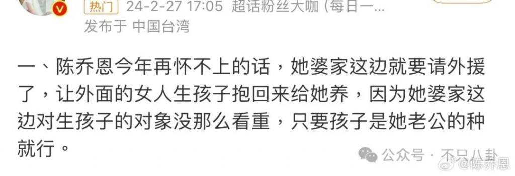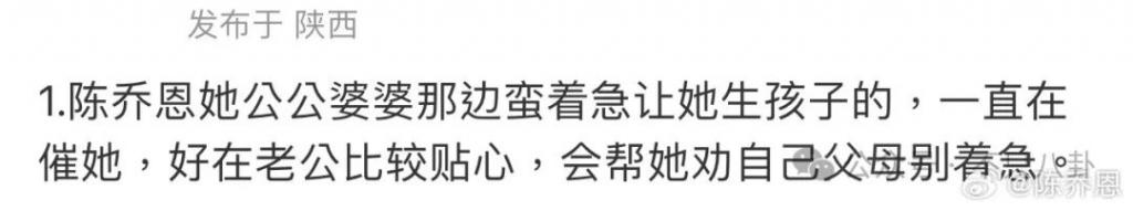 陈乔恩晒出几条爆料截图,都是关于她老公家对她不生孩子的态度,内容之详细,仿佛躲在陈乔恩艾伦床底下听见的一样 ……