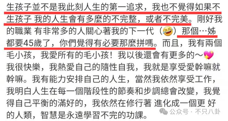 所以,她并没有把生孩子当做此刻人生的第一追求,也不觉得不生孩子人生就不完整了," 姐都要 45 岁了,你们觉得有必要那么拼吗?"