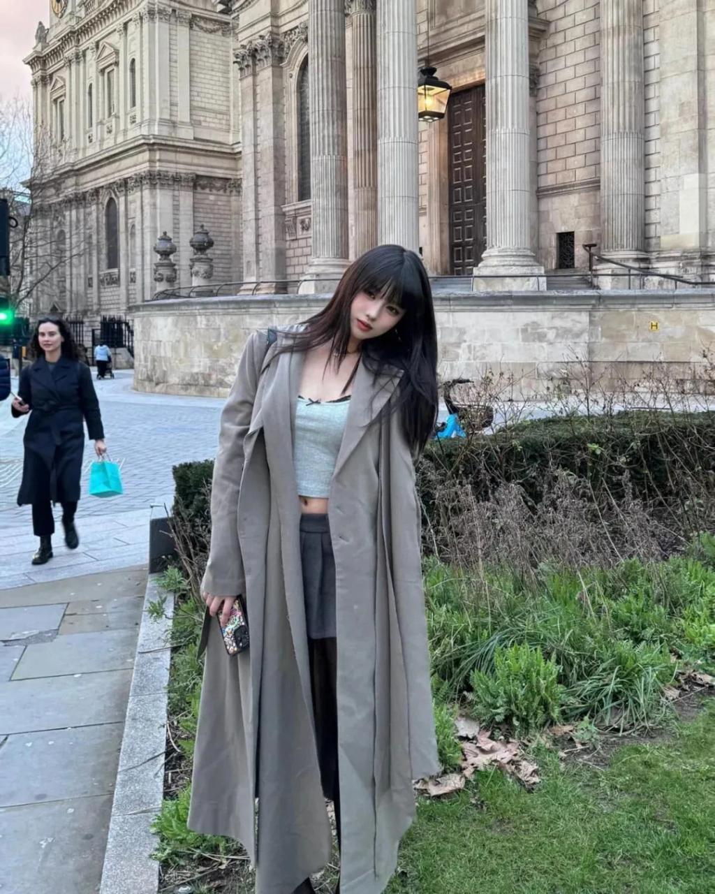 身穿灰色长风衣配学院短裙黑色袜的她,长发披肩漫画刘海,气质斐然,时尚又鲜活,横看竖看都是一个美人胚子。