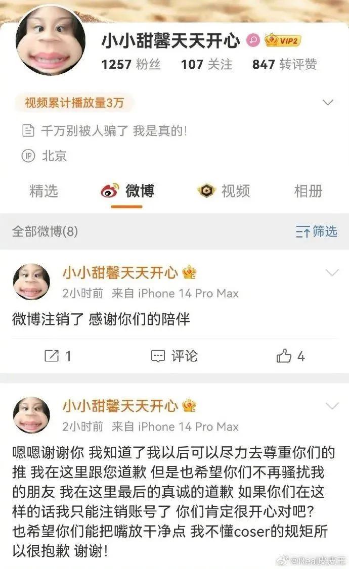 前几天,甜馨由于 cos 初音未来没有戴假发而惨遭二次元群体的口水围攻,在她道歉后还穷追不舍,她也注销了社交账号。