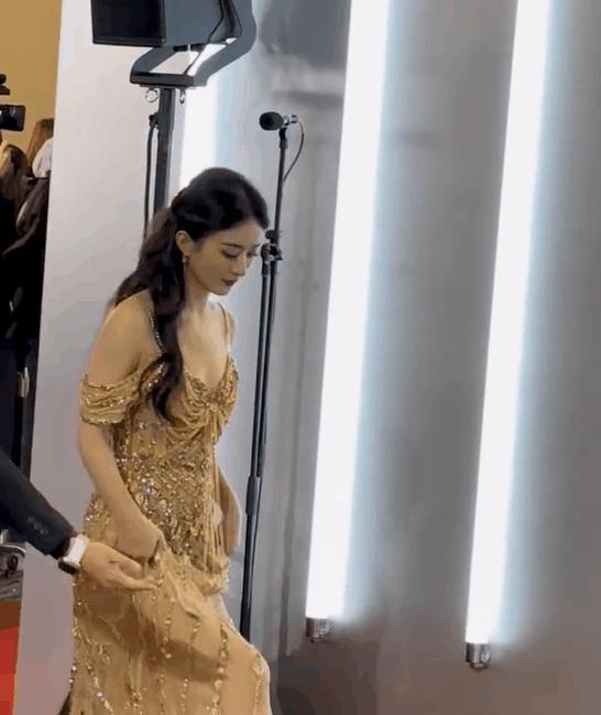 这次她身穿金色闪钻长裙,吊带的设计刚好露出直角肩。