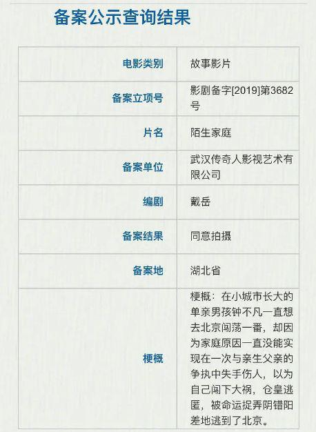 成龙新筹备的作品叫《陌生家庭》,大致讲述的小城市的单亲男孩钟不凡,不甘于落寞,也不甘心自己一辈子都在一座小城市里,所以励志要去北京闯荡。