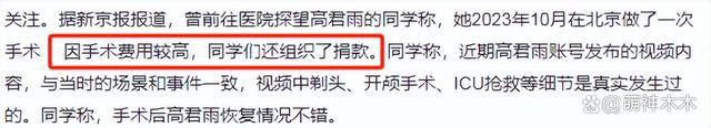 只是,造假视频揭穿的不仅是手术时间线,高君雨的经济状况也受到质疑,童星出身的她真的差钱吗?又是否够格申请专项补助呢?有网友称高君雨曾自曝一年平均消费 20 多万,还提到光艺考一项花费就超过 10 万,这些数字都不是普通家庭承担得起的。
