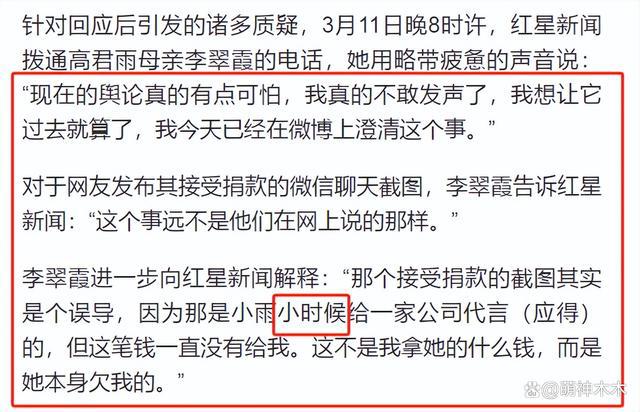 从对话截图逻辑来说,自相矛盾的是高君雨妈妈,先表示那笔钱从未来代言费中扣除,被拆穿后才辩称是欠款,真是打脸不自知。