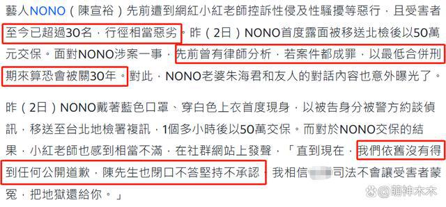 实际上,面对官司 NONO 到处求神拜佛,某种程度上,也是心虚表现,相较于其他被控骚扰的明星,NONO 的案件受害人更多,还保留了不少证据,他败诉被判刑的可能性极高,一旦罪名成立,就要面临 30 年刑期。