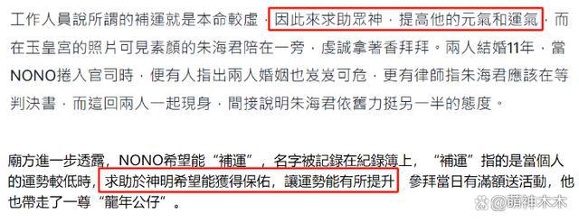 寺庙负责人出面接受了采访,否认了 NONO 去寺庙忏悔,透露他其实是去 " 补运 " 的,说白了,就是 NONO 觉得自己个人运势不好,去寺庙捐钱希望获得神明保佑提升运势。