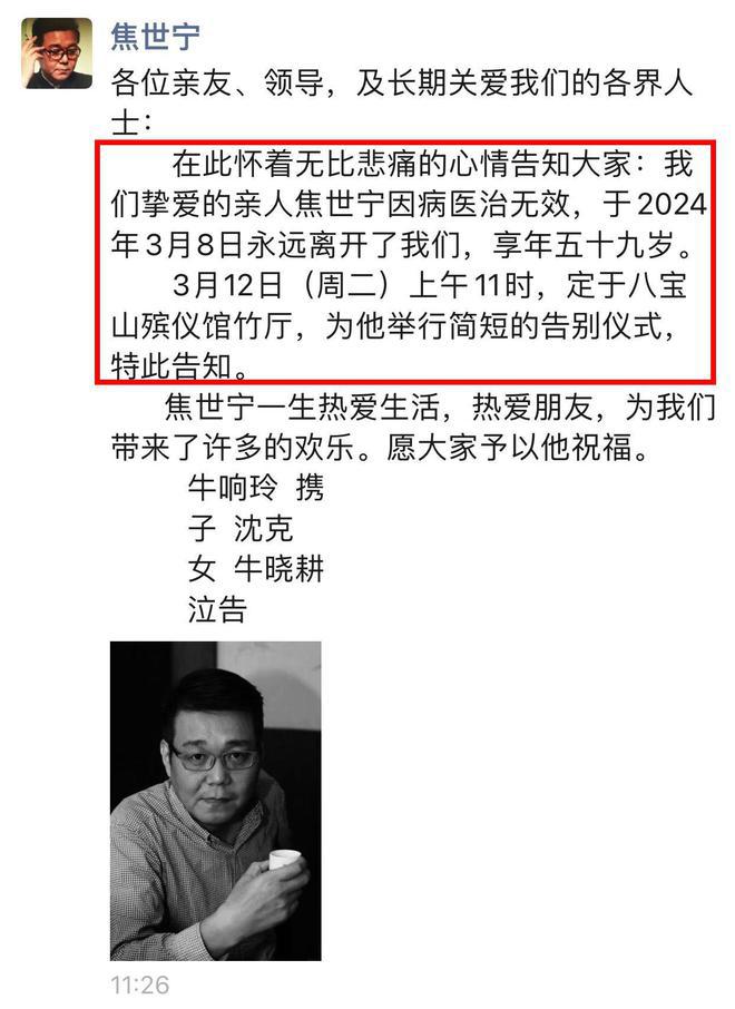 家人还用焦世宁的账号发布朋友圈,透露焦世宁是于 3 月 8 日因病医治无效去世,将在 3 月 12 日八宝山殡仪馆内举行简短的告别仪式。