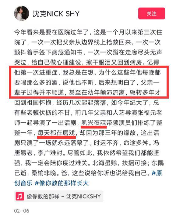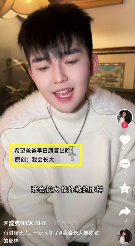 2 月 14 日,沈克又原创了一首歌《我会长大》,希望父亲焦世宁能够早日康复出院。