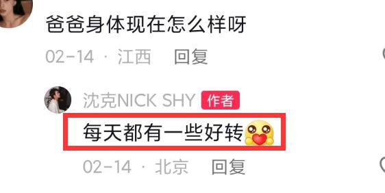 2 月 8 日,沈克透露父亲焦世宁昏迷了 3 天,当天终于苏醒。