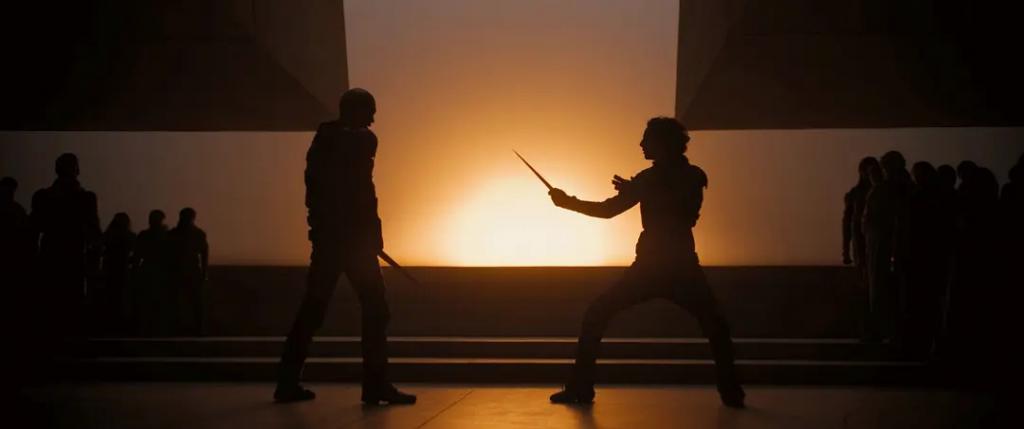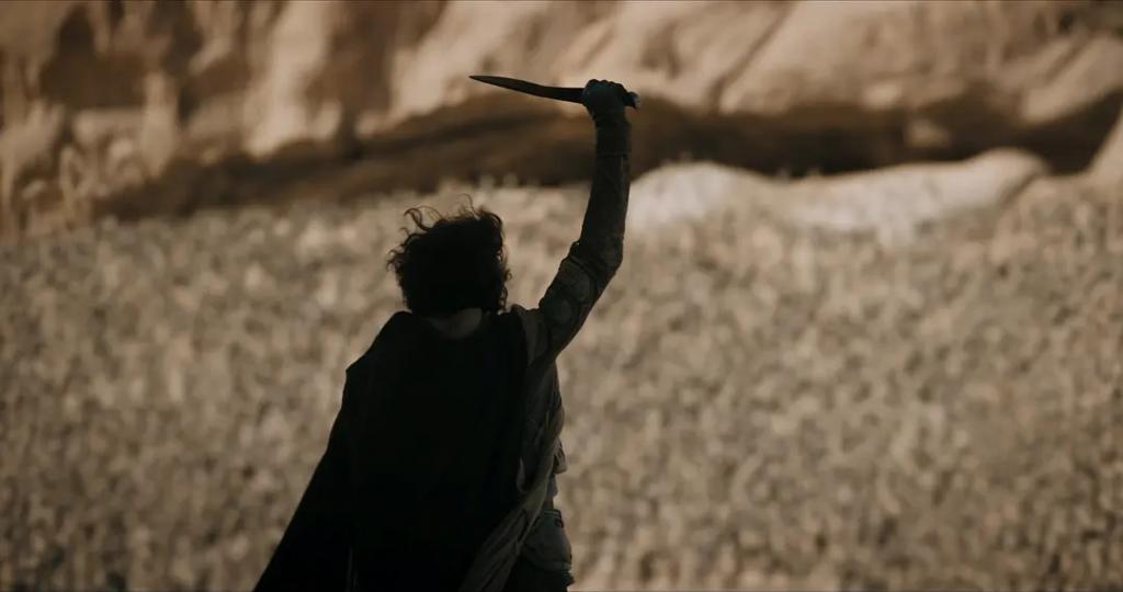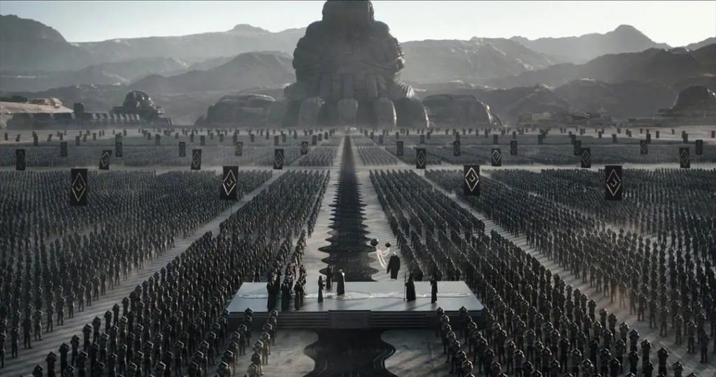 尤其是在《沙丘 2》中,俯瞰镜头下熙熙攘攘的人群、沙虫战队集体出征、以及每一场战斗,维伦纽瓦都在画面上、声音上做足了仪式感。