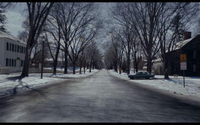 塔利每次出学校都是汉纳姆开车带着他出去,在汉纳姆答应去波士顿之后,随着镜头有些晃荡的前移,车辆缓缓从画右驶入,带出平坦的乡间公路、路边积雪、冬日凋敝的枝桠和光照充沛的蓝天。