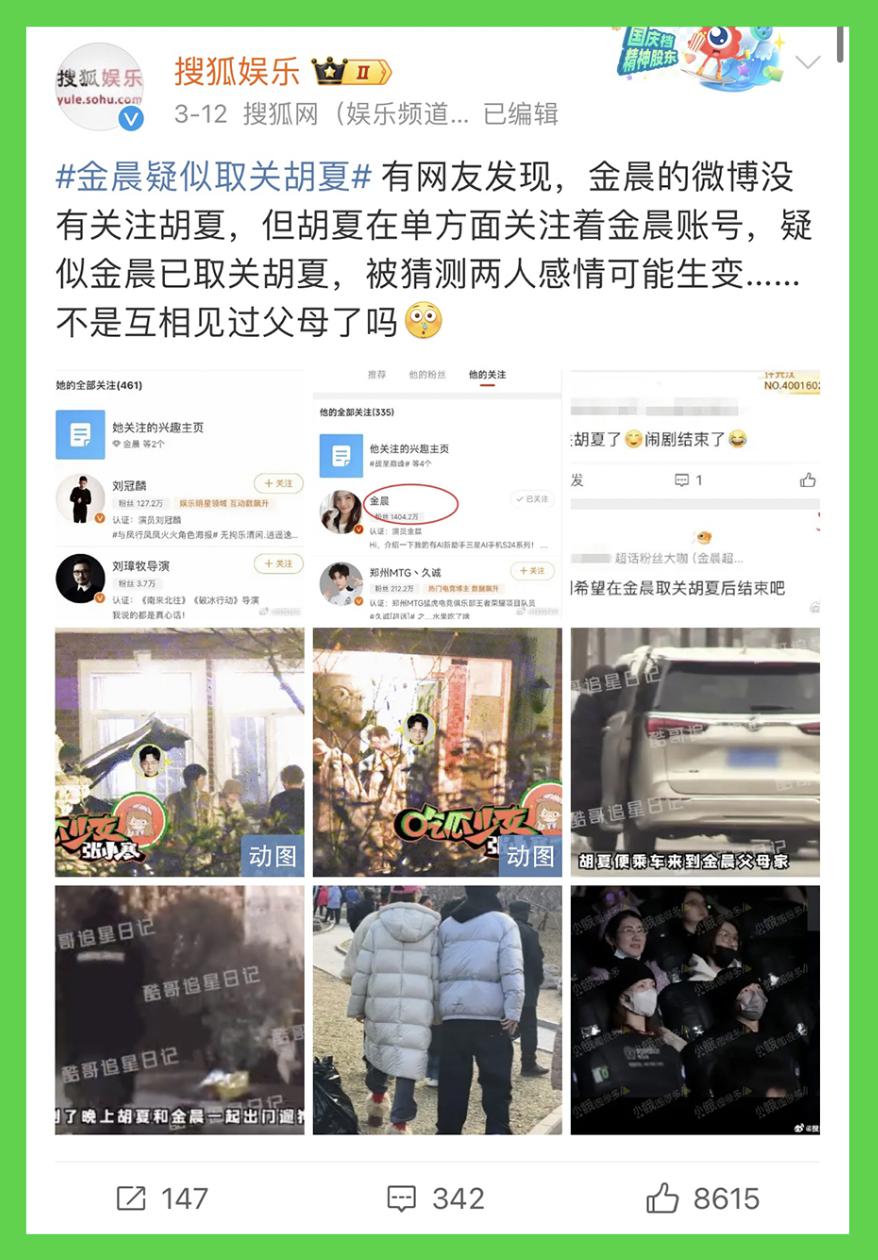 金晨被扒出来已经悄咪咪地取关了胡夏,坊间传闻说他们俩已经 BE 了,但讲真,我倒觉得可能是大家过度解读了。