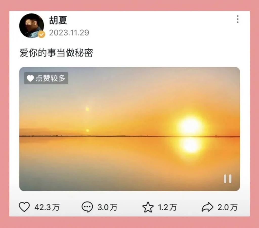 但我觉得最甜的还是他去年发的一条视频,他微笑着指向天边 " 金 " 色的 " 晨 " 光,并配文:爱你的事当做秘密。