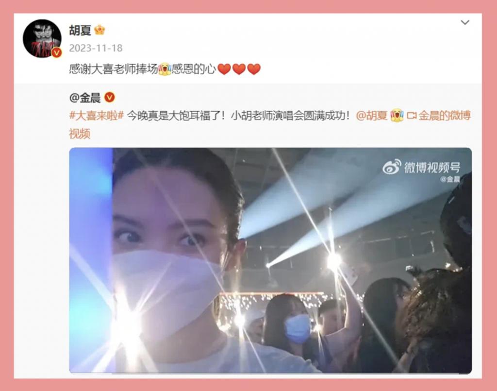 去年 11 月,金晨去胡夏演唱会,大屏幕特意给了金晨一个特写,胡夏在台上的表情瞬间变得害羞,嘴角根本压都压不住