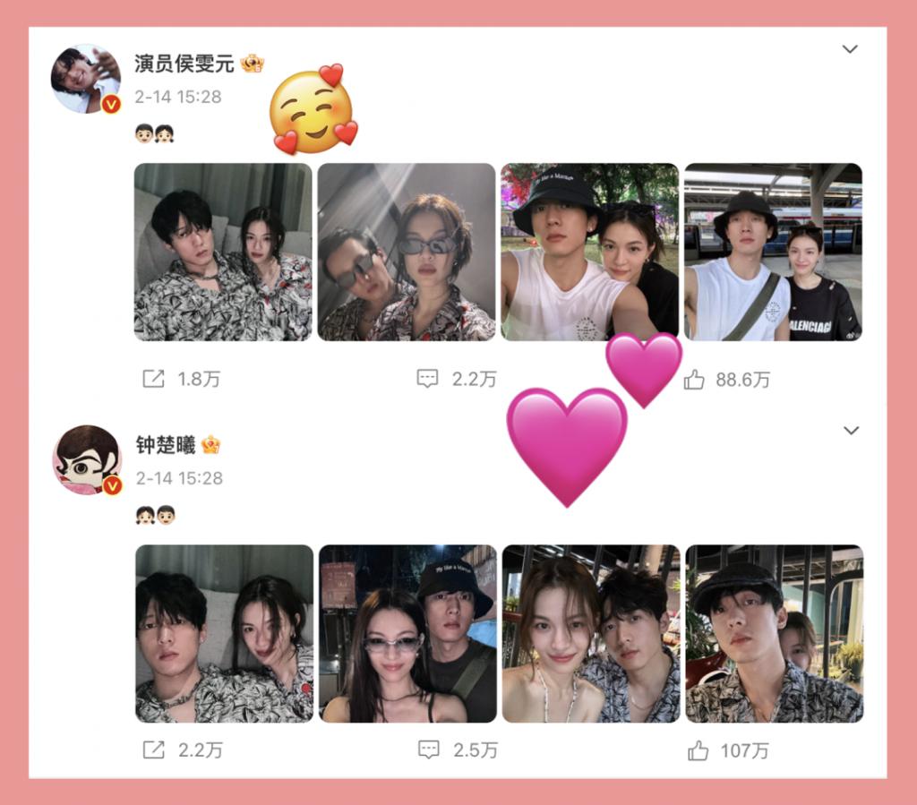 发现照片被曝光之后,俩人干脆就顺势在情人节那天卡点公开了,还附赠了大量男友视角、女友视角的美照。