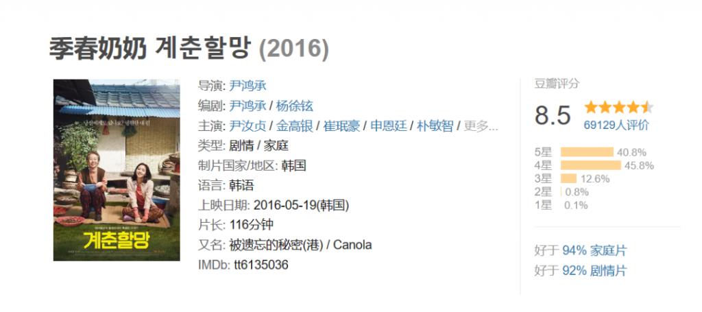 首先,电影又双双为翻拍,翻拍的是 16 年的韩国电影《季春奶奶》。