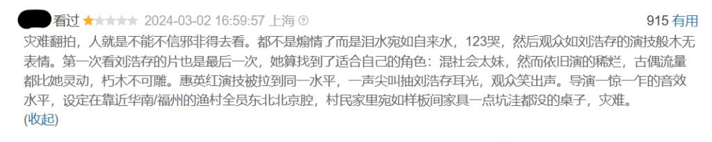 当然这也不能全怪她,导演摄影师出身,只会怼脸把刘浩存拍成我见犹怜的小白花,并不想着去挖掘人性的复杂。