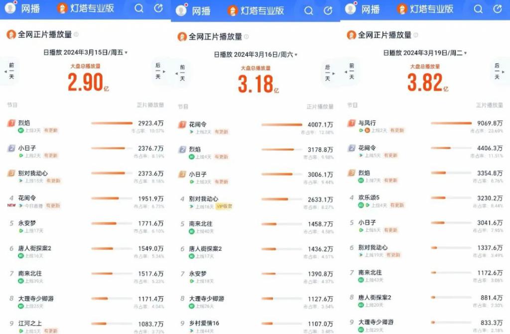 数据方面,最先于 3 月 13 日在爱奇艺上线的《烈焰》,上线第二天,灯塔正片播放量达 2197.9 万,仅次于排名第一的现偶剧《别对我动心》;