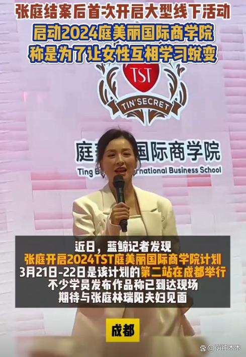 而根据官方媒体披露,张庭在 2024 年宣布开启 2024TST 庭美丽国际商学院计划,而此次她公开亮相的活动是该计划的第二站,在成都举行,早在几天前,就有不少 TST 的学员以及来自全国的代理商们发布作品预热,称自己已经到达现场,期待与张庭林瑞阳夫妇见面。