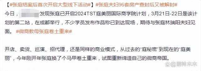 还记得因涉嫌传销被封控 96 套房的张庭吗?她不仅全身而退,还在近日高调带着旗下大军复出了。张庭高调现身成都某线下活动,全程传播各种心灵鸡汤,鼓舞士气,扬言自己 2024 年要带领各位宝妈员工共创一番大事业。
