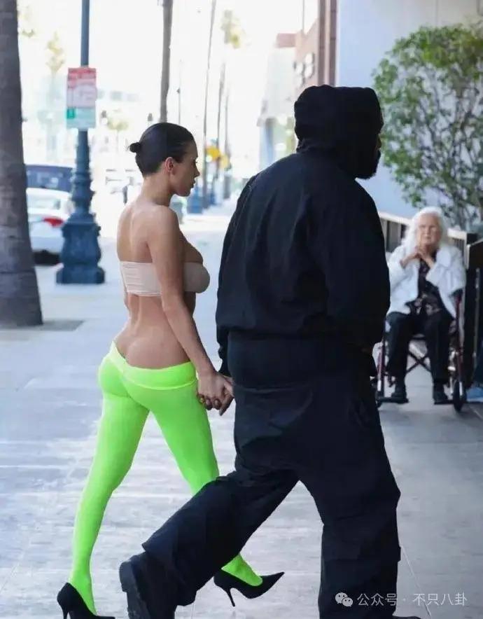 侃爷一如既往的把自己包的严严实实,捂了一身黑,而他老婆 Bianca Censori 则是和他完全相反,上身仅有一个抹胸,下身穿了一条荧光绿裤袜。
