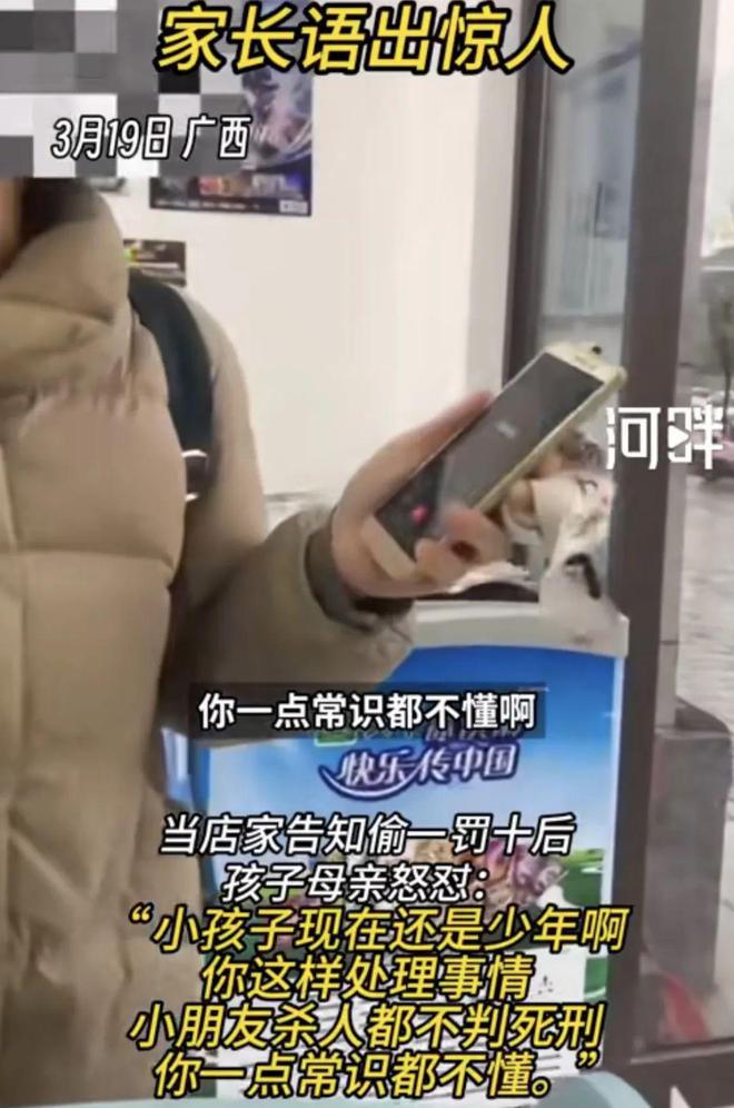 3 月 19 日,广西一网友发视频称一小孩在小卖部偷东西被抓住,联系家长前来处理,当店家告知偷一罚十后,孩子母亲怒怼:" 小孩子现在还是少年啊,你这样处理事情,小朋友杀人都不判死刑,你一点常识都不懂。" 网友表示," 偷一赔十 " 的警示标语只是为了警醒小朋友,并不是作为惩罚的目的,已报警处理,民警口头教育后,学生正常回校上课。